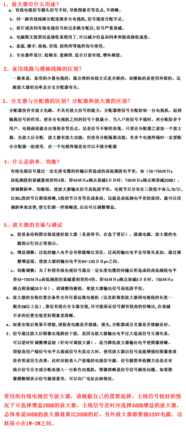 | 4.分支和分配器区别:放大器后接一个分配器到电视,两个以上才能到电视的,中间请用分支器 |